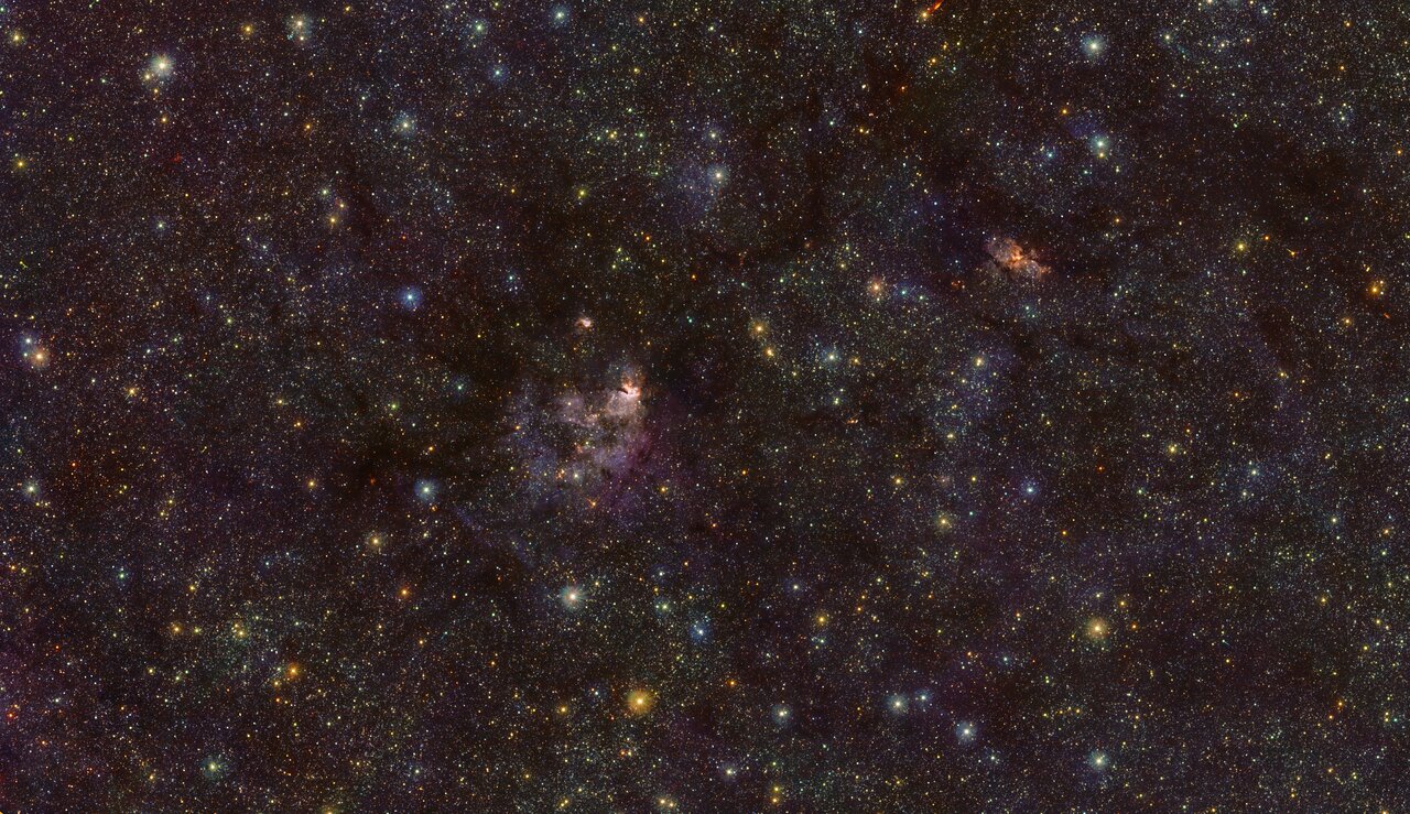 Fühlen Sie sich beim Anblick dieses Bildes der Woche auch verloren? Bei der Erkundung der als IC 2948 bezeichneten Gaswolke müssen Sie sich ihren Weg entlang unzähliger gerade entstehender Sterne bahnen, die in dieser riesigen stellaren Kinderstube geboren wurden. Und doch ist dies nur ein Ausschnitt eines viel größeren Objekts: des Running-Chicken-Nebels (zu deutsch: laufendes Huhn). Dieser Nebel erstreckt sich über eine Fläche am Nachthimmel, die etwa 25 Vollmonden entspricht, und doch ist der Bereich, den Sie hier sehen, nicht einmal ein Drittel eines Vollmondes. Die Aufnahme eines solch detaillierten Ausschnitts des Nebels war dank eines 1,5-Milliarden-Pixel-Bildes möglich, das mit dem VLT Survey Telescope (VST) aufgenommen wurde, das von der ESO betrieben wird.